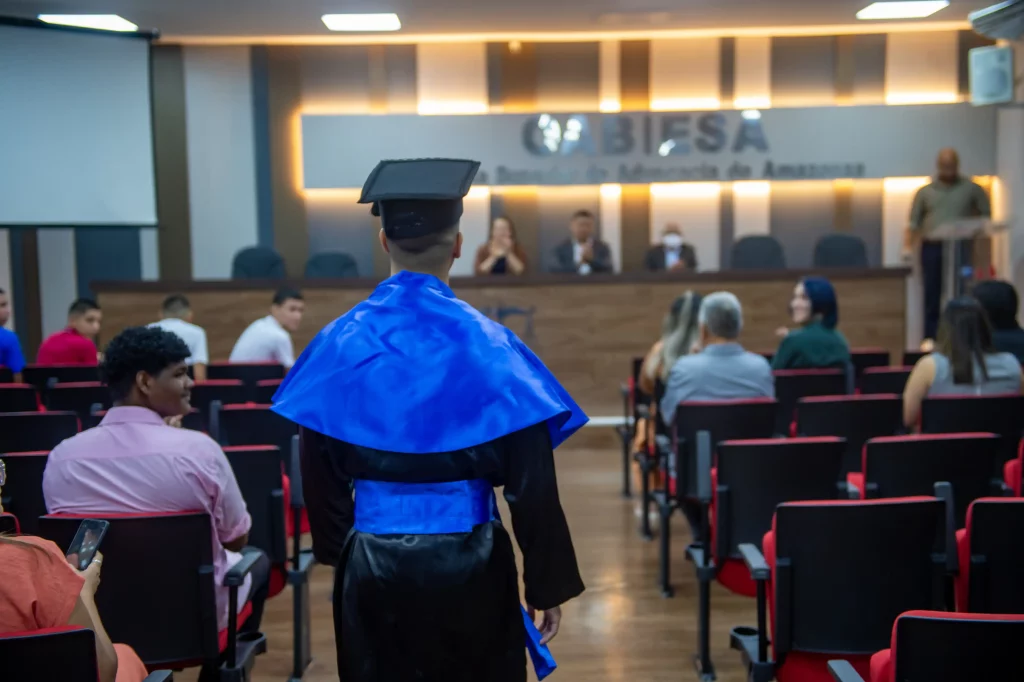 Fotos: Lincoln Ferreira/SejuscAos 17 anos, um socioeducando interno do Centro Socioeducativo Dagmar Feitoza, administrado pela Secretaria de Estado de Justiça, Direitos Humanos e Cidadania (Sejusc), colou grau no Ensino Médio nesta segunda-feira (15/12). A cerimônia ocorreu no auditório da Escola Superior de Advocacia do Amazonas, localizado na rua São Benedito, bairro Adrianópolis, zona centro-sul de Manaus.